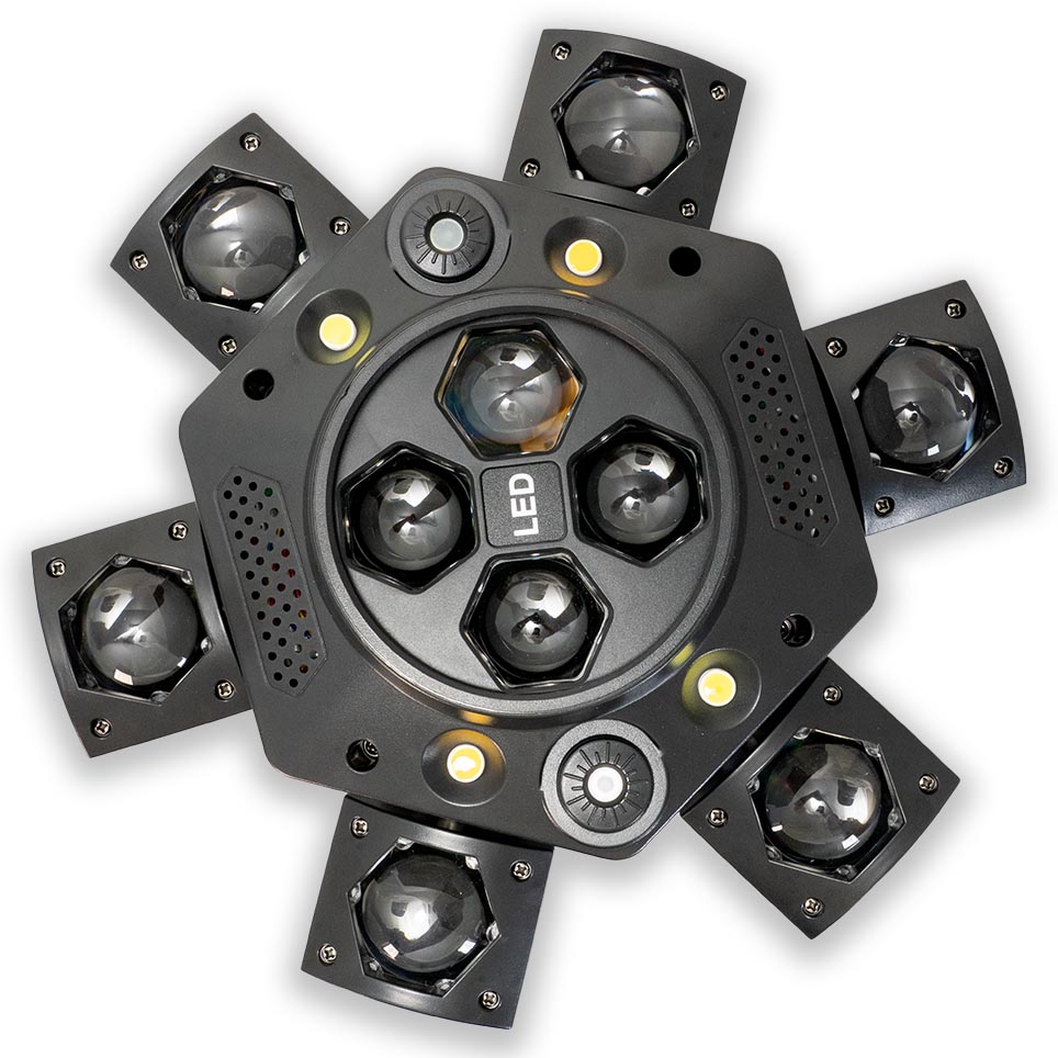 Firstly, ten 10 W CREE RGBW LEDs paint the stage with saturated colour and crisp white. Meanwhile, a 100 mW red and 50 mW green laser cut through haze with razor-sharp aerial effects. Dual white and amber 10 W strobes unleash blinding bursts at up to 20 flashes per second for moments that demand attention.