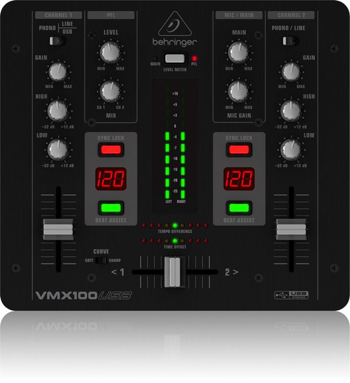 The Behringer VMX100USB is a compact 2-channel DJ mixer designed for aspiring DJs. The mixer features 2 BPM counters, tempo gauge, and USB connectivity for playback direct from your laptop or computer.