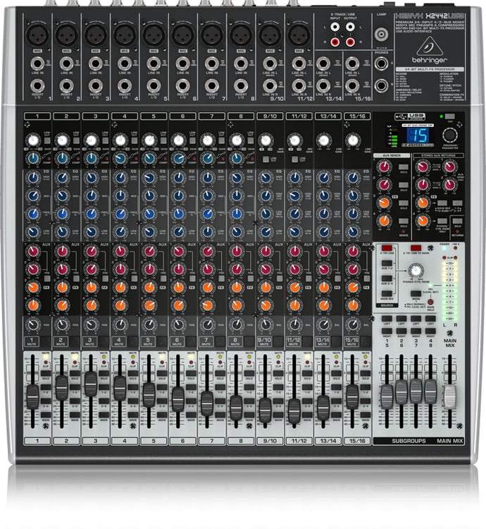 The Behringer Xenyx X2442USB is a professional 16-channel PA mixer with everything you need to get a great sound all at your finger tips. Includes built-in digital FX, USB sound card, 4-sub groups, and more.. Perfect for bands, venues, and smaller concerts.