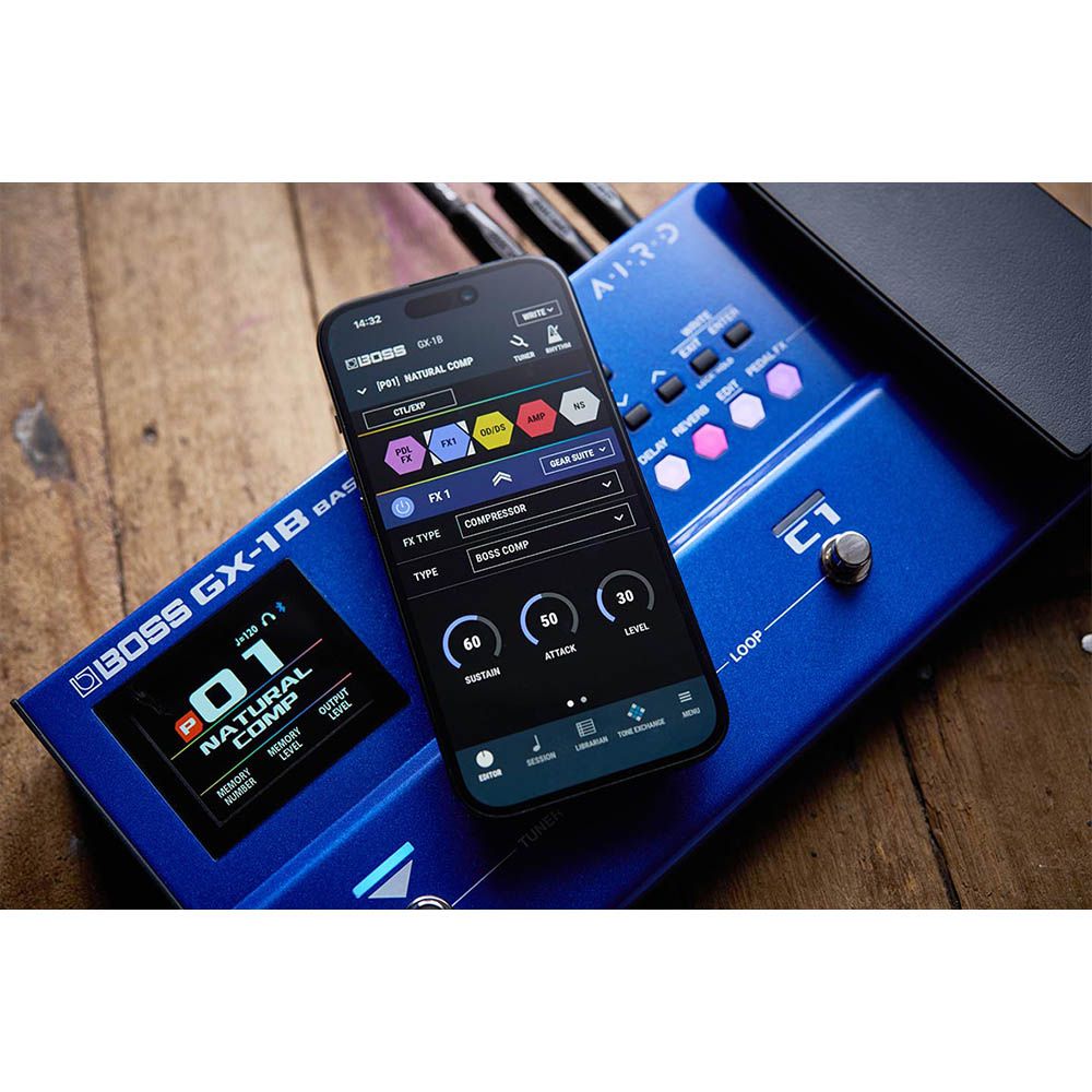 Firstly, the GX-1B harnesses BOSS’s renowned AIRD technology for authentic tube amplifier tone and touch response. With 16 expressive amplifier types and over 130 expert BOSS effects, you have an expansive palette to shape your sound. Moreover, eight effect blocks plus a volume pedal and noise suppression let you craft complex, rich tones for any style or stage setting.