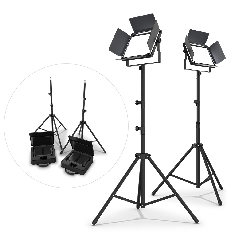 The DJ Cast Panel Pack consists of 2x light fixtures (w/ barn doors), 2x external power supplies, 2x tripods and 2x carry bags.