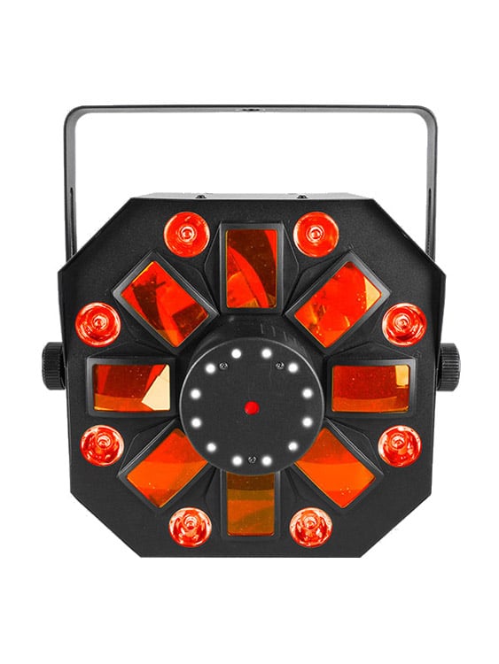 • 4-in-1 LED light that combines an RGBAW rotating derby, RGB+UV wash, red/green laser, and a ring of white SMD strobes