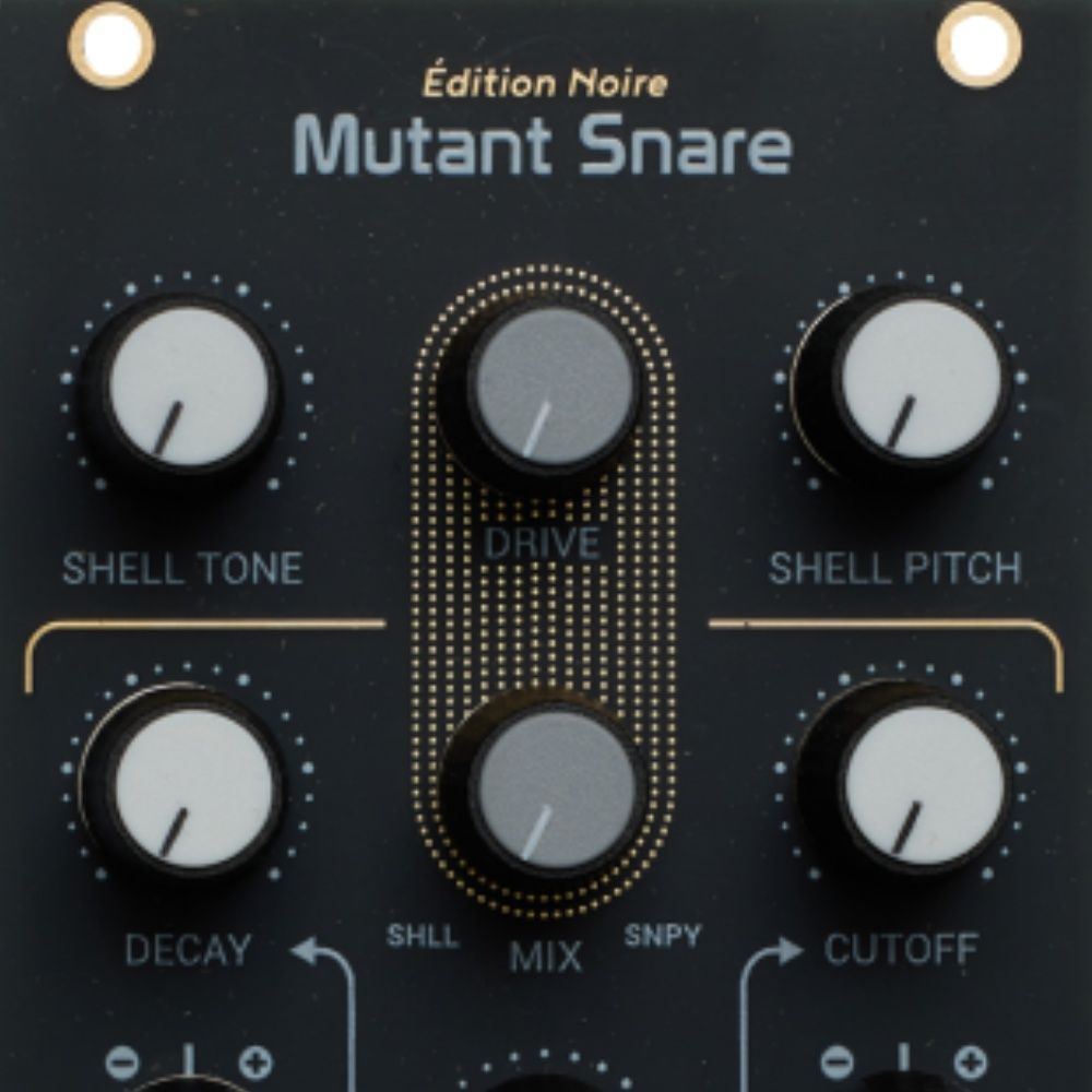 Firstly, the Mutant Snare uses dual bridged-t analog sinewave oscillators that provide a warm and organic base sound reminiscent of the famous 808 snare. The TONE control allows smooth blending between two sinewaves of different frequencies. Thus, giving you a broad palette of sounds. You can also tune one sine wave with the SHELL PITCH control to precisely set the snare’s pitch.