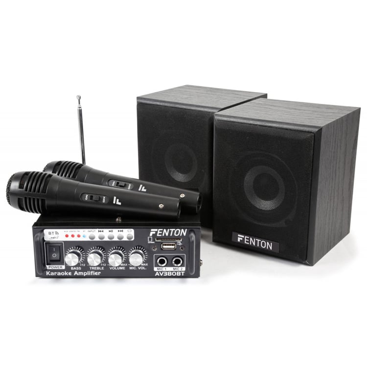 The Fenton AV380BT is a complete plug and play system with speaker, amp, and 2 wired microphones. Designed to give you complete flexibility the amplifier supports USB and SD inputs to play music, as well as a stereo RCA line input to connect an external CD player or device. Or stream your music wirelessly from your favourite device with the built-in Bluetooth receiver. Further more the amplifier has 2 microphone inputs allowing you to connect two microphone (supplied) and sing along to your favourite songs, it has a constant classic karaoke echo effect applied to your voice which can't be turned off. Making this compact speaker set-up the ultimate portable karaoke system for around the home or your next party.