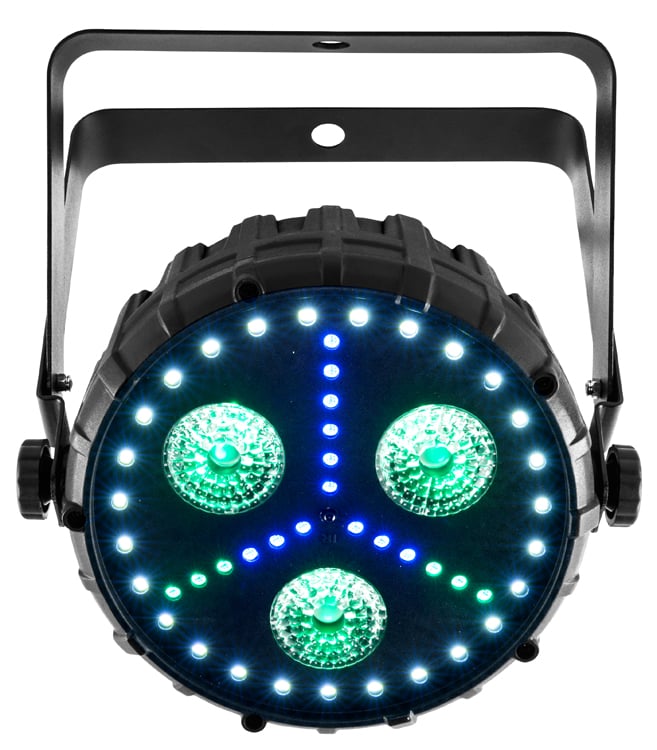 The Chauvet DJ FXpar 3 is a compact LED effect par that combines multiple effects into one amazing fixture. Including 3x bright 8W RGB + UV LEDs, 18x RGB SMD LEDs, and 27x White SMD LEDs. Plus built-in auto and sound programs that use the different effects to create an amazing light show. The FXpar 3 also allows you to control each of the effects separately, and is compatible with the IRC6 wireless remote. Or via DMX for a more dynamic effect or for use with a larger lighting show. Great for DJs, bands, and venues wanting to enhance their dance floor.