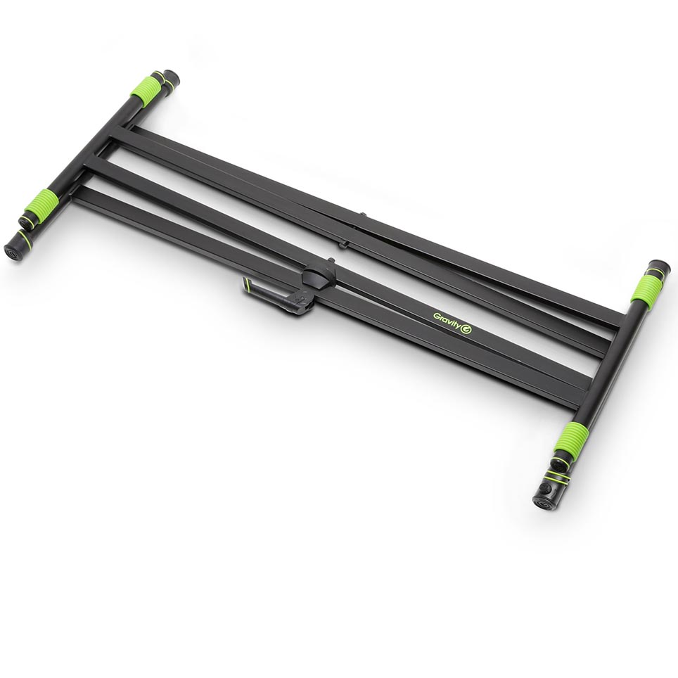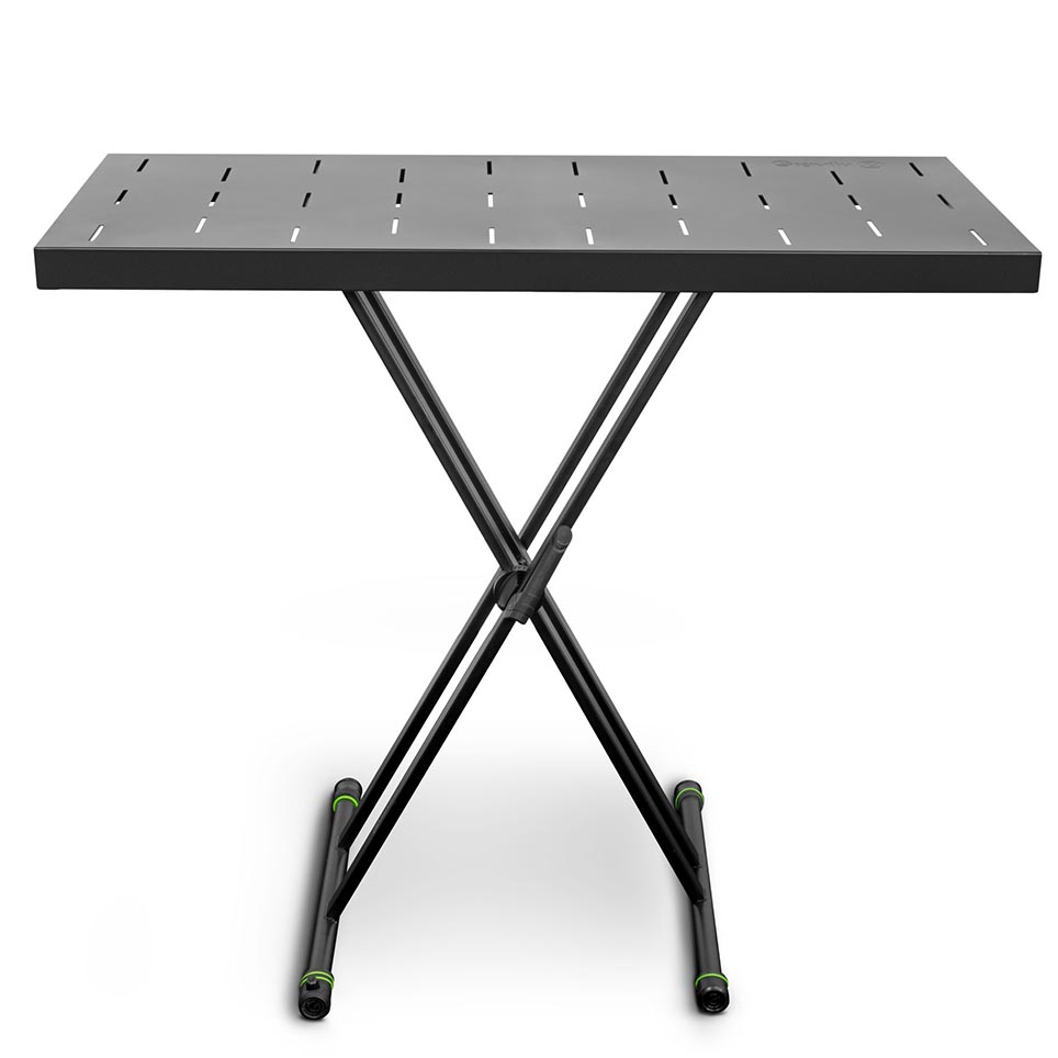 Firstly, designed for touring musicians, the Gravity KSX2RD set combines the rugged Gravity KSX2 double X-form keyboard stand with the Rapid Desk 1 tabletop. Additionally, this smart combo allows for quick, tool-free setup and teardown. You can transform this set into two flat pieces for easy transport and storage on the road.
