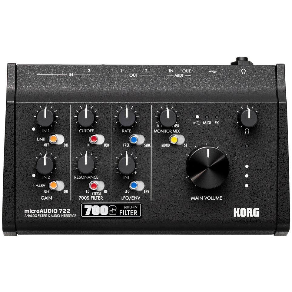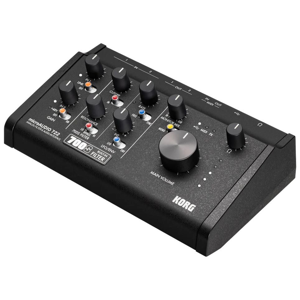 The microAUDIO 722 merges pristine 24-bit/192 kHz converters with the musical warmth of the classic miniKORG 700S analogue filter. This compact desktop hub delivers transparent headroom, expressive tone-shaping and the agility today’s creators demand.