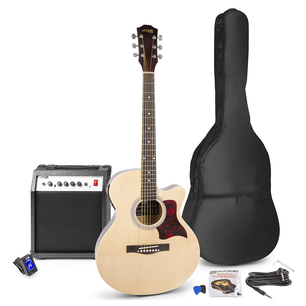 The MAX Showkit in Natural gives you everything you need in a complete electric-acoustic guitar pack. Not only will you get a steel-string Acoustic Guitar Combo, but you’ll also get a high-quality 40 Watt guitar amplifier. As well as a durable soft case, digital clip-on tuner, a guitar lead, guitar picks, shoulder strap and even a spare string set. Perfect for any beginner guitar player, this electric acoustic guitar pack offers a wide range of features. Allowing you to play a variety of sounds that cover a plethora of music genres.