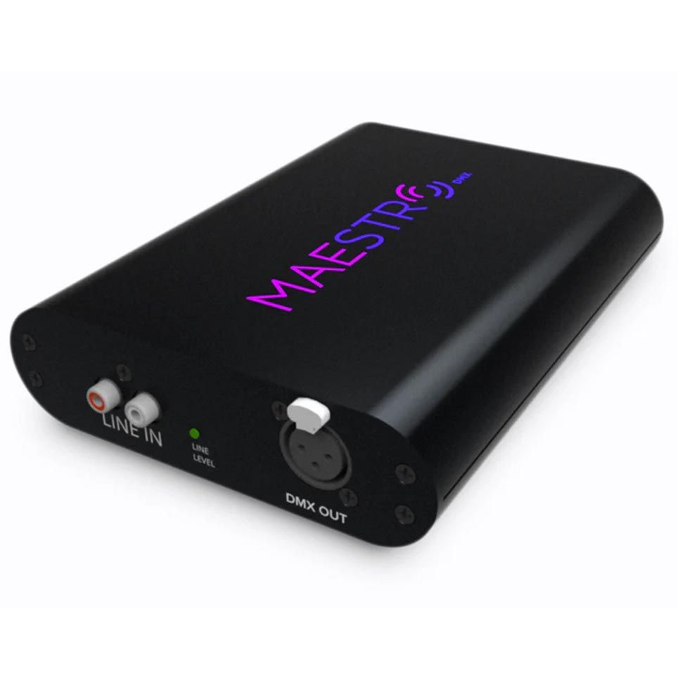Firstly, the integrated AI engine listens to the incoming audio via the RCA line input. Then, interprets tempo, intensity and dynamic shifts, and triggers fluid lighting scenes across every connected DMX-512 fixture. From intimate acoustic sets to arena rock, MaestroDMX scales automatically, keeping the visual energy locked to the music in real time.