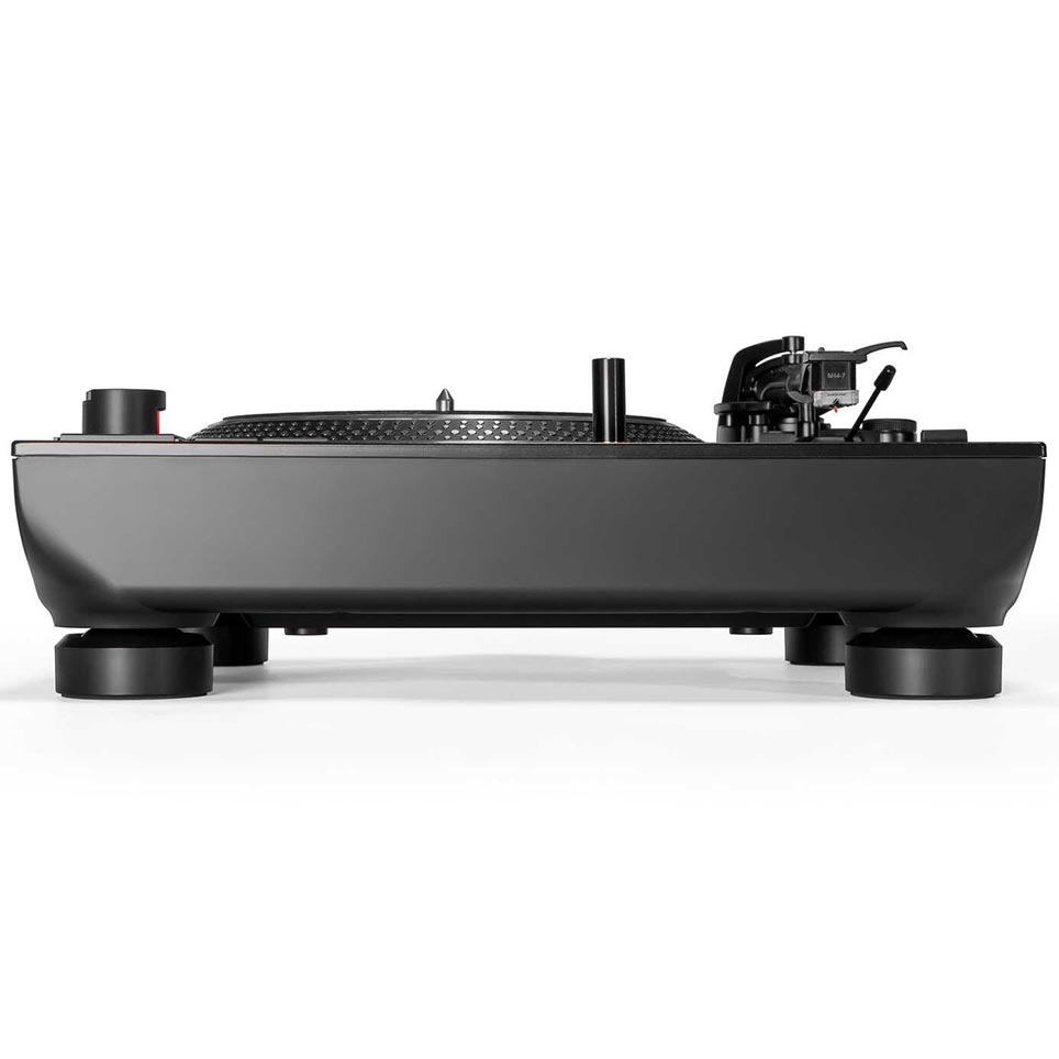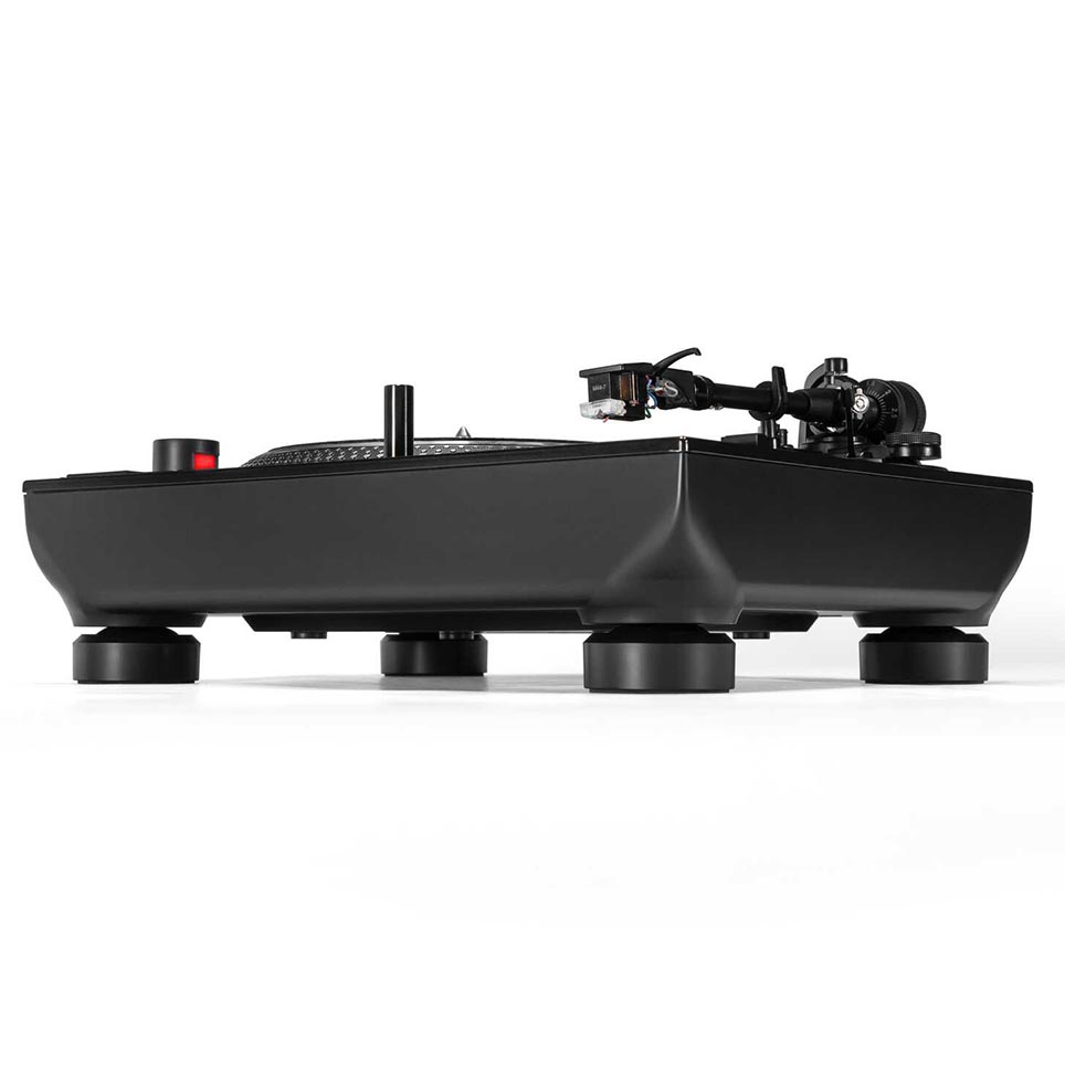 Rejoice in the straight copper tonearm with internal rubber damping for exceptional tracking accuracy and reduced resonance. Adapted from Reloop’s flagship models, the height-adjustable VTA base ensures flexibility for any setup. Moreover, with its statically balanced system, the RP-7 eliminates the need for anti-skating and streamlining installation.