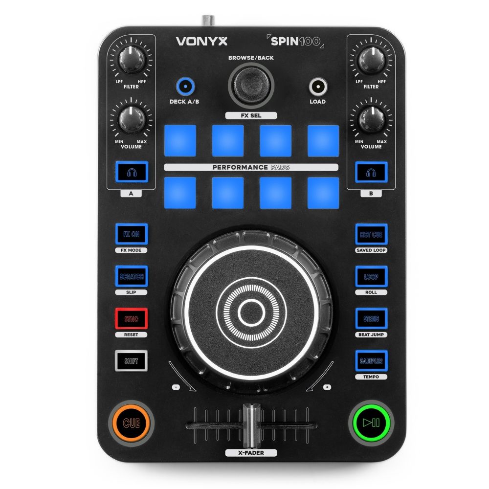 Firstly, the Spin100 combines easy-to-use jog wheels and performance pads with a built-in 4-channel audio interface. Therefore, you get crisp sound quality without extra equipment. Plus, the included Virtual DJ LE software means you can start mixing right out of the box, no hassle needed.