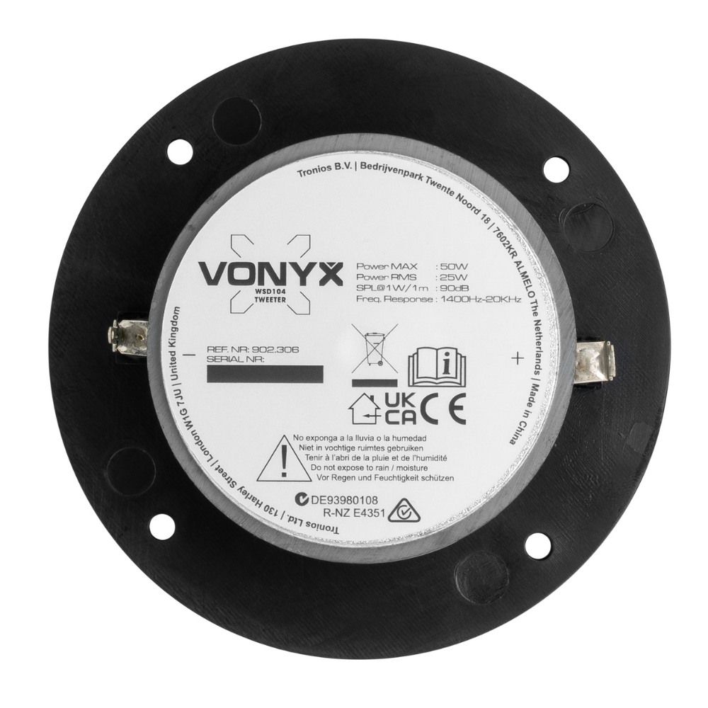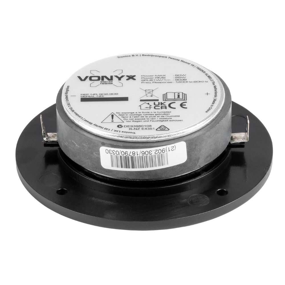 Furthermore, the Vonyx WSD104 features a 25mm voice coil and an ABS faceplate that ensures durability and reliable performance. Its excellent radiation pattern allows for wide sound dispersion. Consequently, enhancing your audio setup whether you’re replacing an old tweeter or upgrading a hi-fi system.
